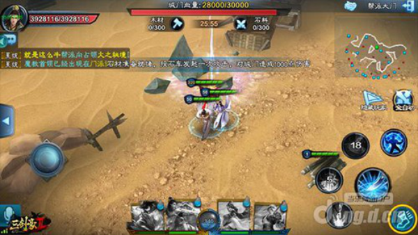 在战斗持续时间内,攻击方需要不断击破“石料”,用以填充投石车攻击城门。当城门血量为0时,攻击方获胜。当战斗时间结束时,城门仍未被击破,则防守方胜利。然而,在攻击方采集“石料”时,防守方也会在同一地图收集“木材”,用来给城门加血。(小学题目里的同时装水和放水的数学题?)。当然,双方不可能相安无事的进行材料收集,最好的办法就是击杀对方的帮众,干扰其进行采集活动!