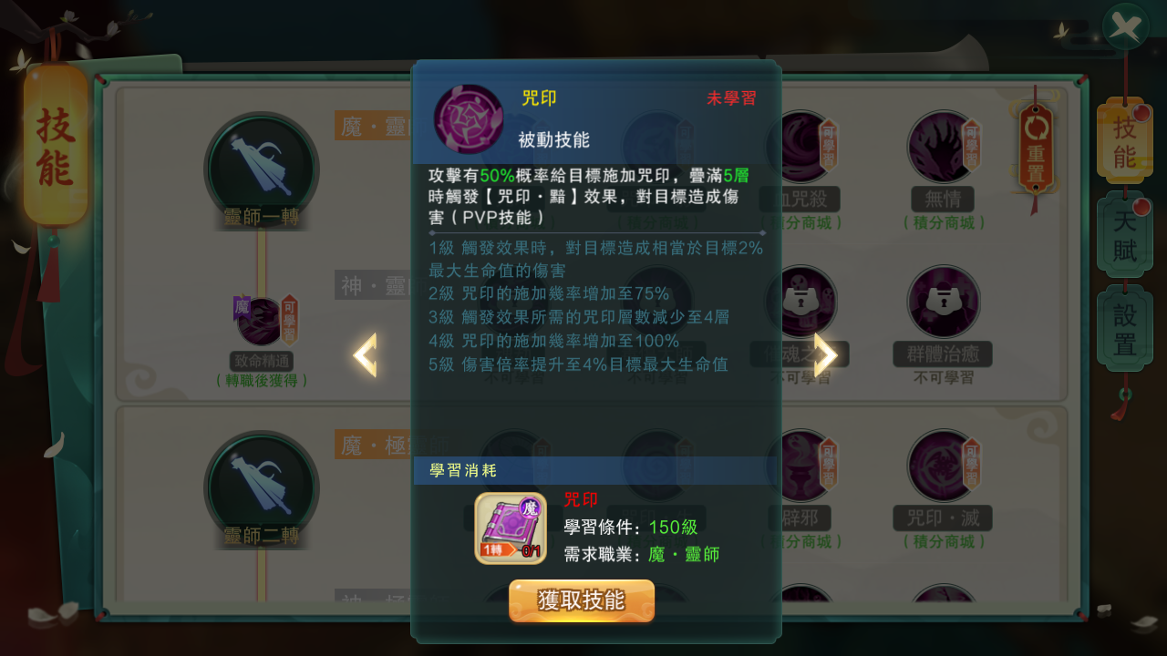 游戏内的技能系统可玩性极高,除了一开始可以学习基础技能之外,到了150级后可以进行首次转职