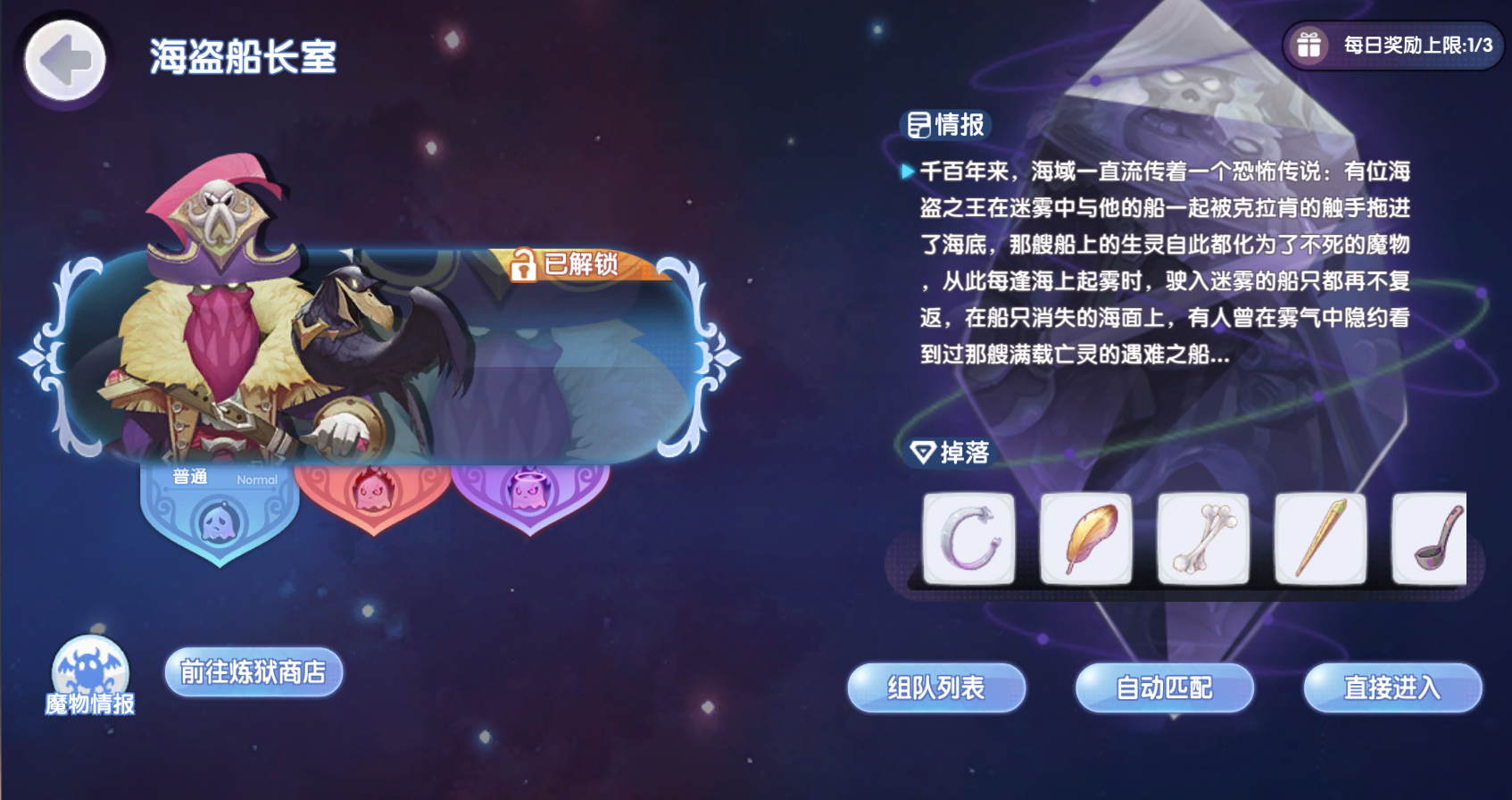 玩家35级之后完成系列主线冥霭降临系列可以解锁海盗船长室副本,挑战通关普通副本后,解锁困难模式。炼狱模式难度更高,35级不一定能通关,可等装备实力提升后再来挑战。