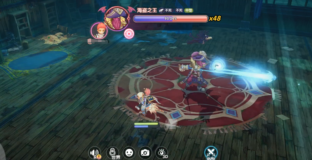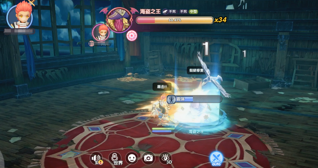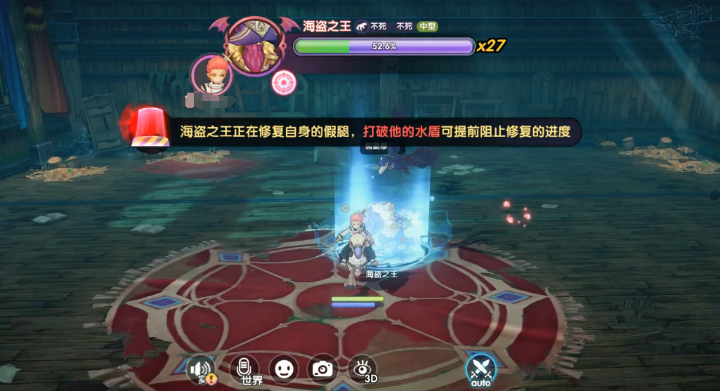 技能效果:当BOSS血量下降至50%后,海盗之王会开始修复自己的假腿,同时身上也会出现护盾,如果不能将护盾击破,则BOSS在修复假腿过程中会不断回血。