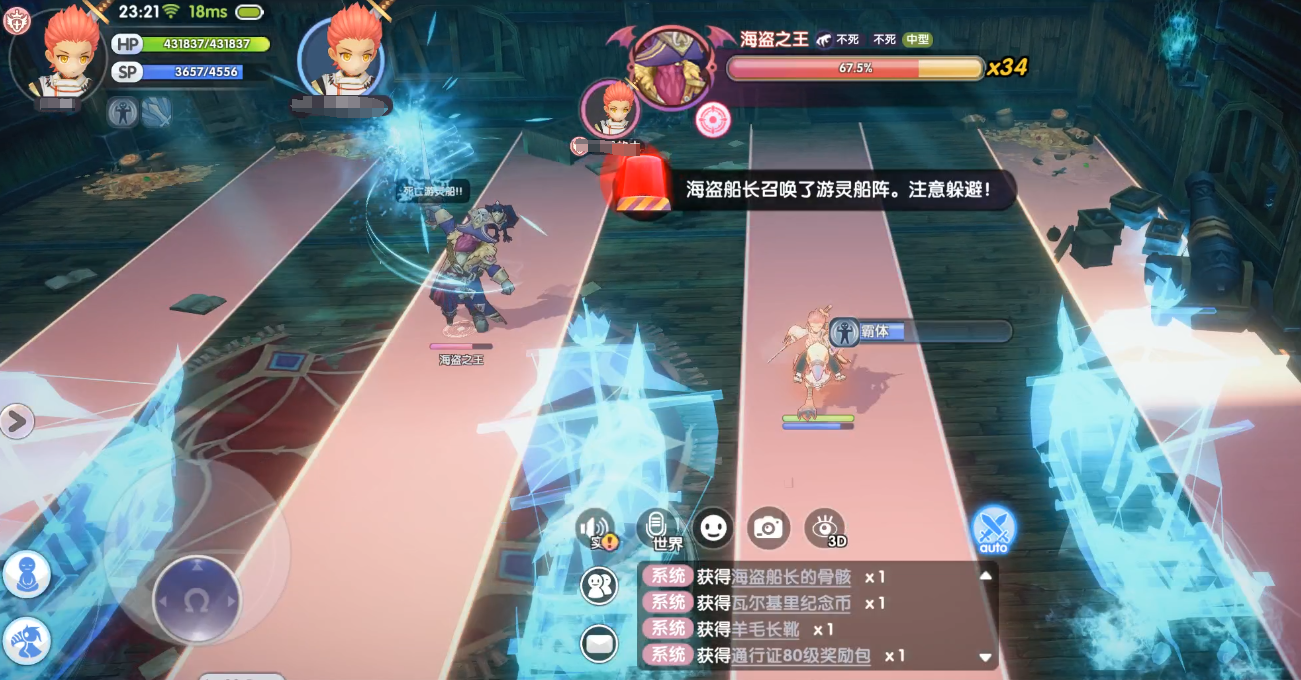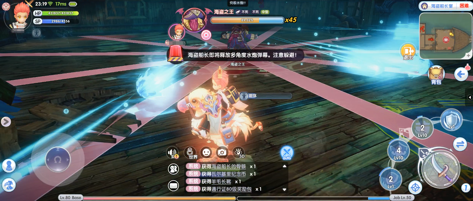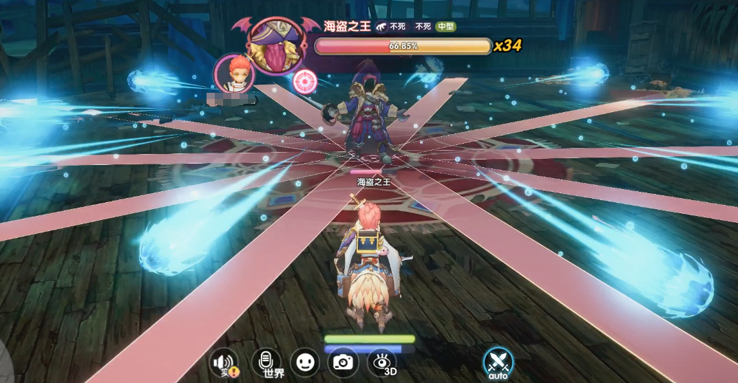 应对措施:当看到画面中“海盗船长即将释放多角度水炮弹幕。注意躲避”的字样时,先确保与BOSS之间拉开一定的距离,这样等到多条弹幕出现时,很容易就能找到躲避的空位,轻松化解该技能。