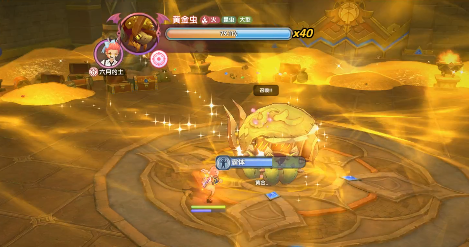 技能效果:BOSS血量下降至50%后,黄金虫会跳回场地中央进入无敌状态,同时场地周围四个角会出现四只小黄金虫爬向BOSS,若让小黄金虫成功接近BOSS,则BOSS会回血。